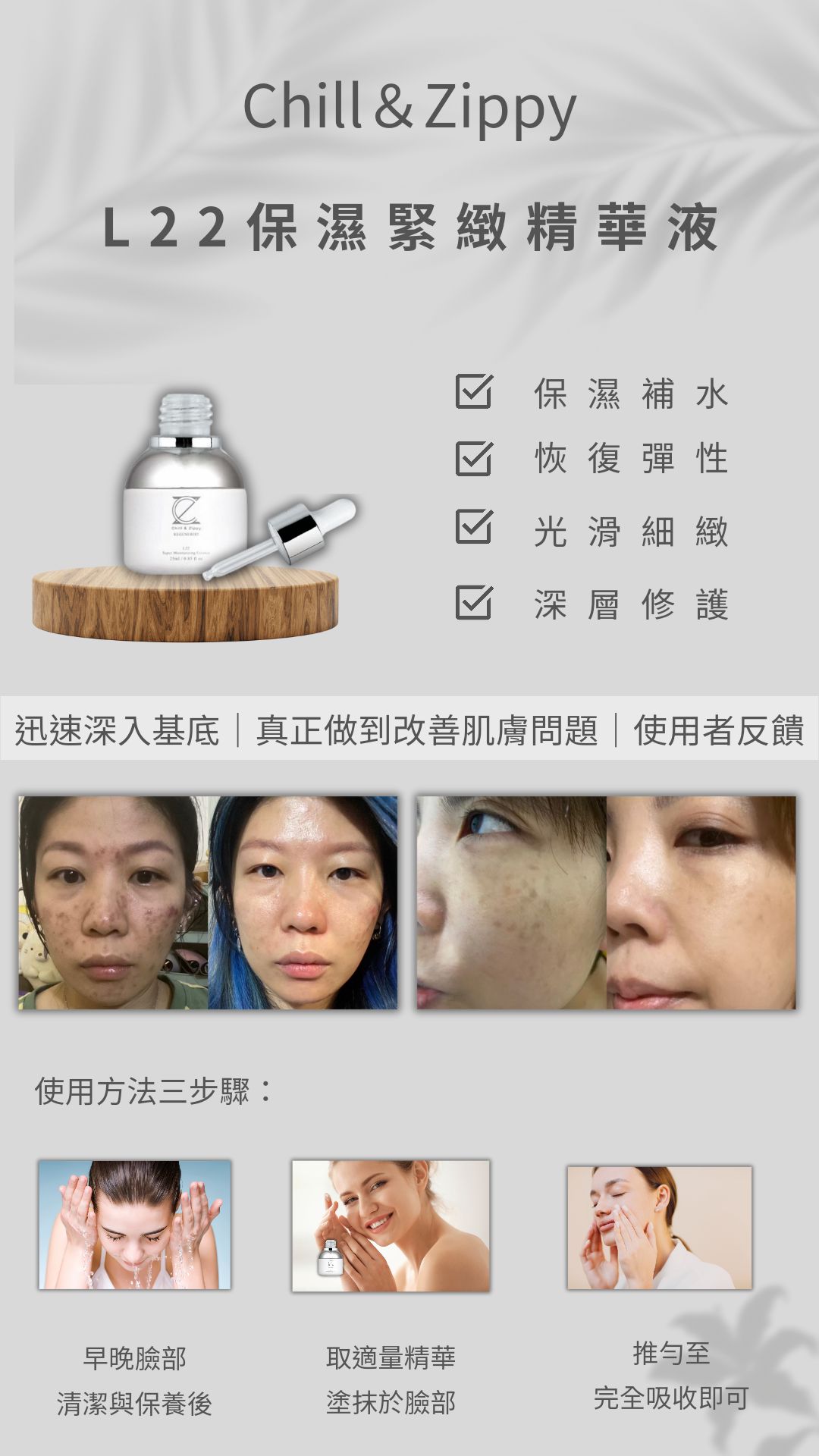 容易被肌膚吸收直達肌膚底層,並且能在皮膚表面形成保護膜,防止水分散失,有效幫助修護肌膚,提高肌膚水分含量,恢復緊緻與活力,使肌膚變得光滑細緻有彈性。強化肌膚的修護及防護,強效保濕、深層修護,讓肌膚透出年輕潤澤的明亮光采。使用方法:早晚於清潔與化妝水後,取適量塗抹於臉部及頸部肌膚,推勻至完全吸收即可。